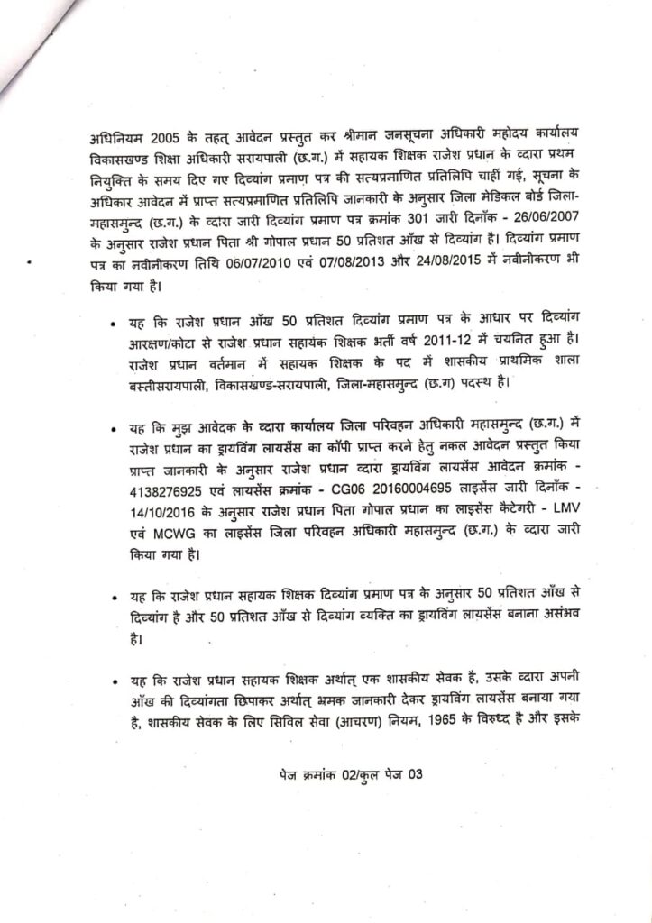 महासमुंद/सरायपाली : मामला जिला महासमुन्द के सरायपाली का है राजेश प्रधान जो सहायक शिक्षक के पद पर शासकीय प्राथमिक शाला बस्तीसरायपाली विकासखण्ड सरायपाली में पदस्थ है। राजेश प्रधान का जिला मेडिकल बोर्ड जिला-महासमुन्द (छ.ग.) के द्वारा जारी 50 प्रतिशत आँख से दिव्यांग प्रमाण पत्र के आरक्षण कोटा में प्रथम नियुक्ति हुआ है, लेकिन 50 प्रतिशत आँख की दिव्यांगता छिपाकर अर्थात् कार्यालय जिला परिवहन अधिकारी महासमुन्द (छ.ग.) भ्रमक जानकारी देकर ड्रायविंग लायसेंस भी बनवा डाला। मामला का खुलासा तब हुआ जब सूचना के अधिकार के तहत् अभिनय शाह ने जब जनसूचना अधिकारी कार्यालय विकासखण्ड शिक्षा अधिकारी सरायपाली को जब राजेश प्रधान सहायक शिक्षक के व्दारा प्रथम नियुक्ति के समय प्रस्तुत दिव्यांग प्रमाण पत्र की सत्यप्रमाणित प्रतिलिपि जानकारी चाहीं गई। जानकारी प्राप्त होने के बाद आवेदक ने कार्यालय जिला परिवहन अधिकारी महासमुन्द (छ.ग.) में राजेश प्रधान का ड्रायविंग लायसेंस का सत्यापित कॉपी के लिए नकल आवेदन दिया, ड्रायविंग लायसेंस का कॉपी मिलने के बाद चौंकाने वाले तथ्य सामने आएं। राजेश प्रधान का दिव्यांग प्रमाण पत्र जिला मेडिकल बोर्ड जिला- महासमुन्द (छ.ग.) के व्दारा जारी दिव्यांग प्रमाण पत्र क्रमांक 301 जारी दिनाँक – 26/06/2007 के अनुसार राजेश प्रधान पिता श्री गोपाल प्रधान 50 प्रतिशत आँख से दिव्यांग है। दिव्यांग प्रमाण पत्र का नवीनीकरण तिथि 06/07/2010 एवं 07/08/2013 और 24/08/2015 में नवीनीकरण भी किया गया है। राजेश प्रधान के द्वारा आँख से 50 प्रतिशत दिव्यांग प्रमाण पत्र का लाभ लेकर दिव्यांग आरक्षण कोटा से सहायक शिक्षक भर्ती वर्ष 2011-12 में चयनित हुआ है। राजेश प्रधान वर्तमान में सहायक शिक्षक के पद में शासकीय प्राथमिक शाला बस्तीसरायपाली, विकासखण्ड-सरायपाली, जिला-महासमुन्द (छ.ग) पदस्थ है। राजेश प्रधान व्दारा ड्रायविंग लायसेंस आवेदन क्रमांक – 4138276925 एवं लायसेंस क्रमांक – CG06 20160004695 लाइसेंस जारी दिनाँक – 14/10/2016 के अनुसार राजेश प्रधान पिता गोपाल प्रधान का लाइसेंस कैटेगरी – LMV एवं MCWG का लाइसेंस जिला परिवहन अधिकारी महासमुन्द (छ.ग.) के व्दारा जारी किया गया है। शिकायतकर्ता ने इस सम्बन्ध में परिवहन विभाग से जानकारी पता किया तो पता चला कि 50 प्रतिशत दिव्यांग आँख व्यक्ति का ड्रायविंग लायसेंस बनना संभव ही नहीं है, इससे यह स्पष्ट होता है कि राजेश प्रधान सहायक शिक्षक ने ड्रायविंग लायसेंस बनाते समय स्वयं घोषणा पत्र (जो ड्रायविंग लायसेंस बनाते समय फार्म भरना पड़ता है) में अपनी दिव्यांगता को छिपाई है अर्थात् परिवहन विभाग को भ्रमक जानकारी देकर ड्रायविंग लायसेंस बनवाया है। दिव्यांग प्रमाण पत्र की छायाप्रति और ड्रायविंग लायसेंस का छायाप्रति संलग्न कर म